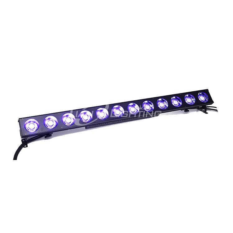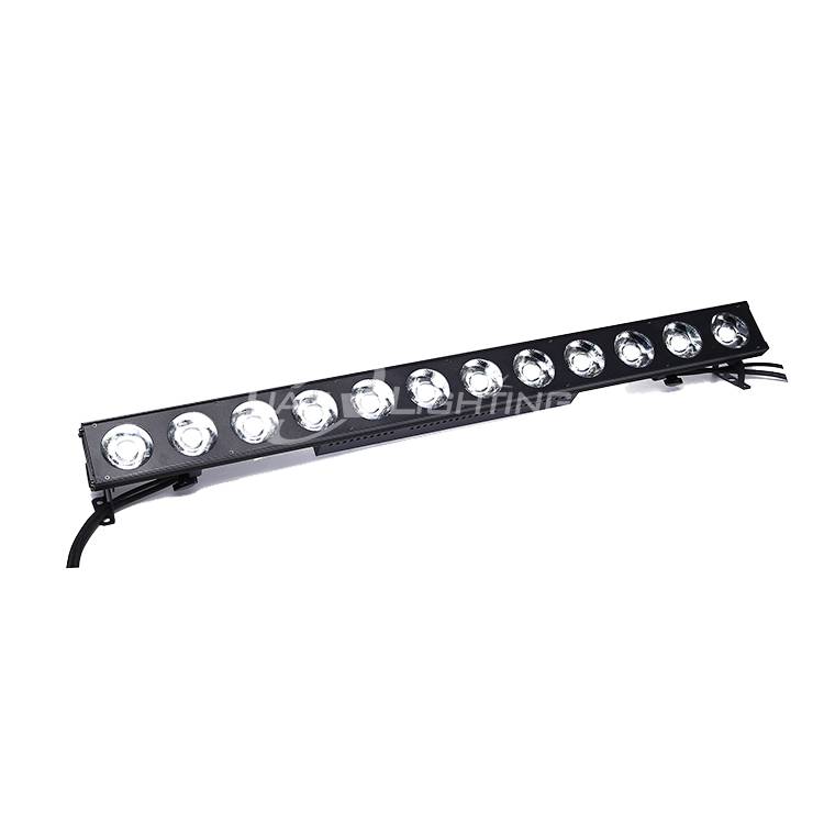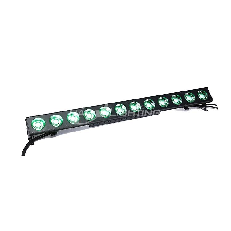 Voltage: 100-240V / 50-60Hz Power : 250W LED QTY : 12* 20W RGBWA 5 in1 LED 32 bit ARM chip , 0-100% fine soft linear dimming 4K-20K HZ frequency, flicker free Direct DMX512 input With RDM & CTO function 'Over-heat’ protection with excellent cooling capacity Beam angle: 15° LED display DMX channels: 5/12ch 7 kinds DMX channel mode : 〖STAG,ARC.1,AR1.d,ARC.2,AR2.d,AR2.S,HSV〗 Mode: DMX512, Sound, Auto, master/slave Housing: Die casting aluminium housing Net weight: 5.5KG Size : 1000*85*135mm Packing size : 1060*220*365mm (4in1 carton)